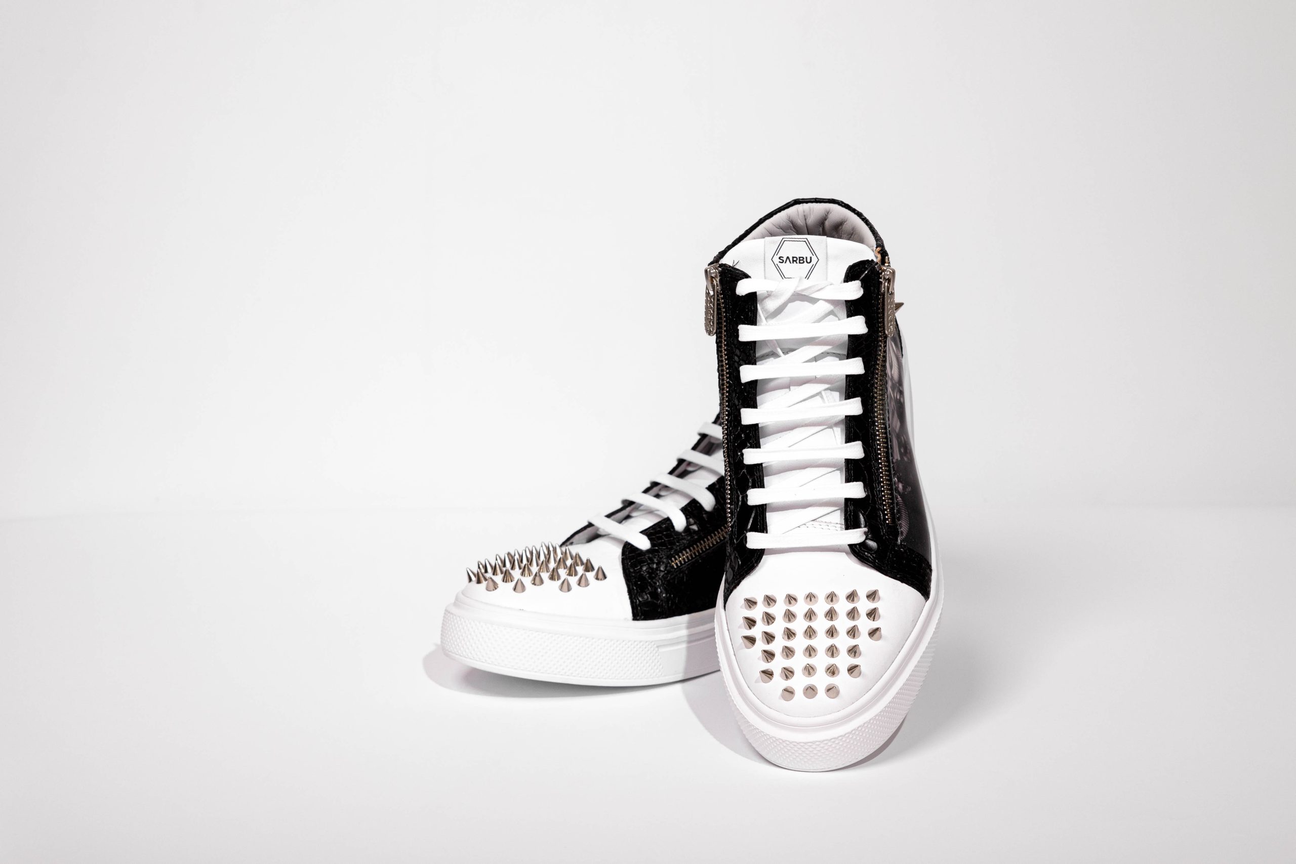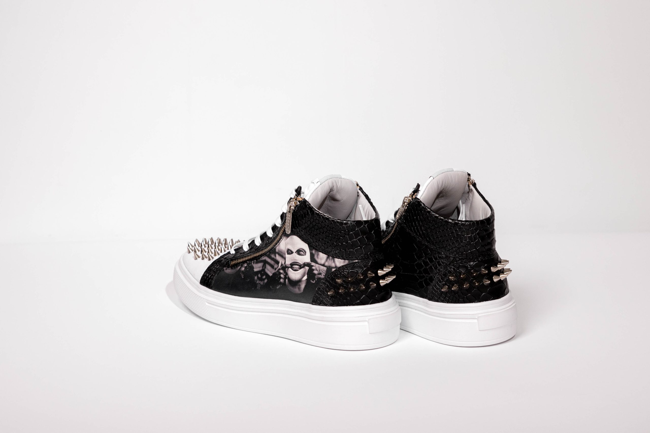 Embellished white large silver studs and printed leather.