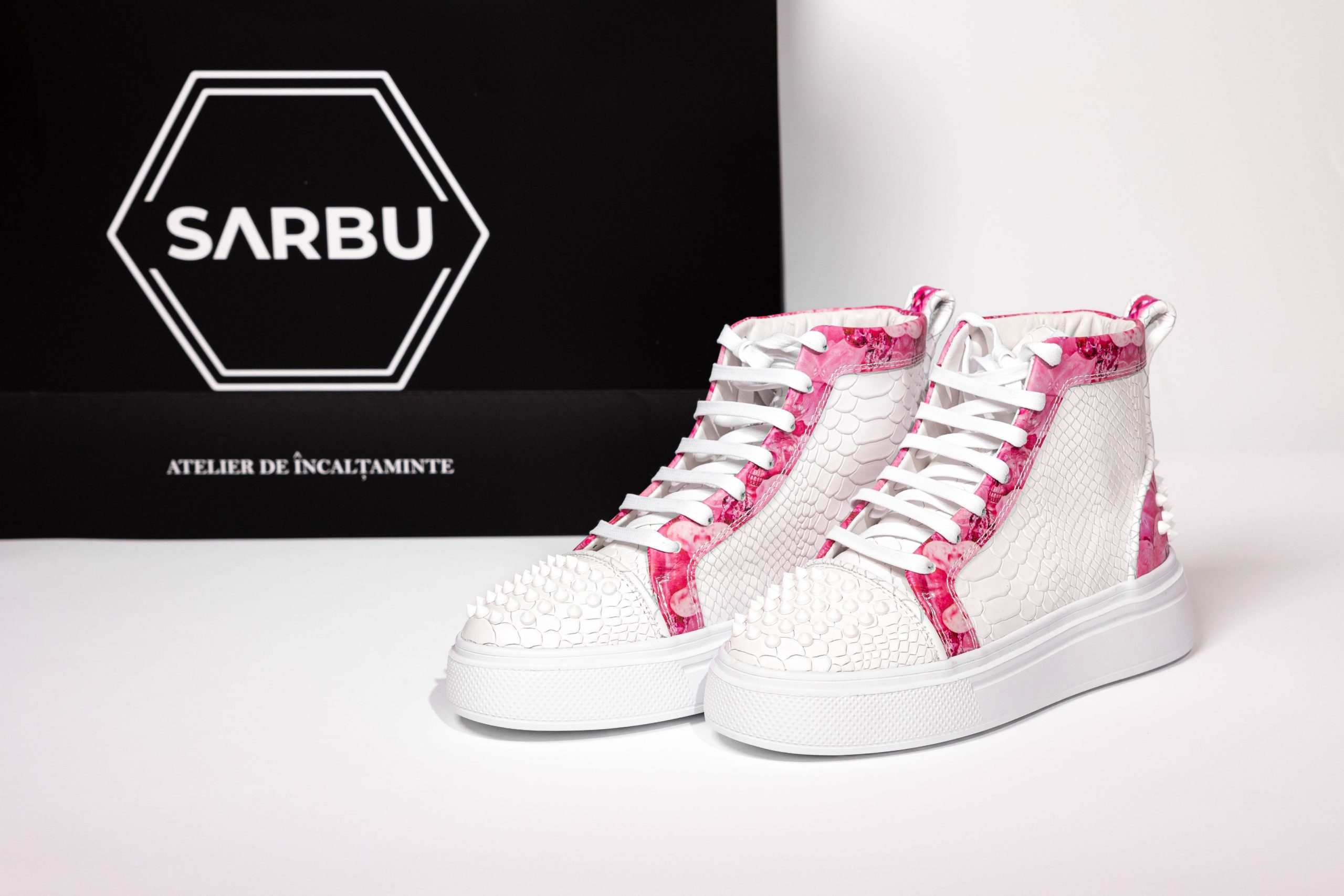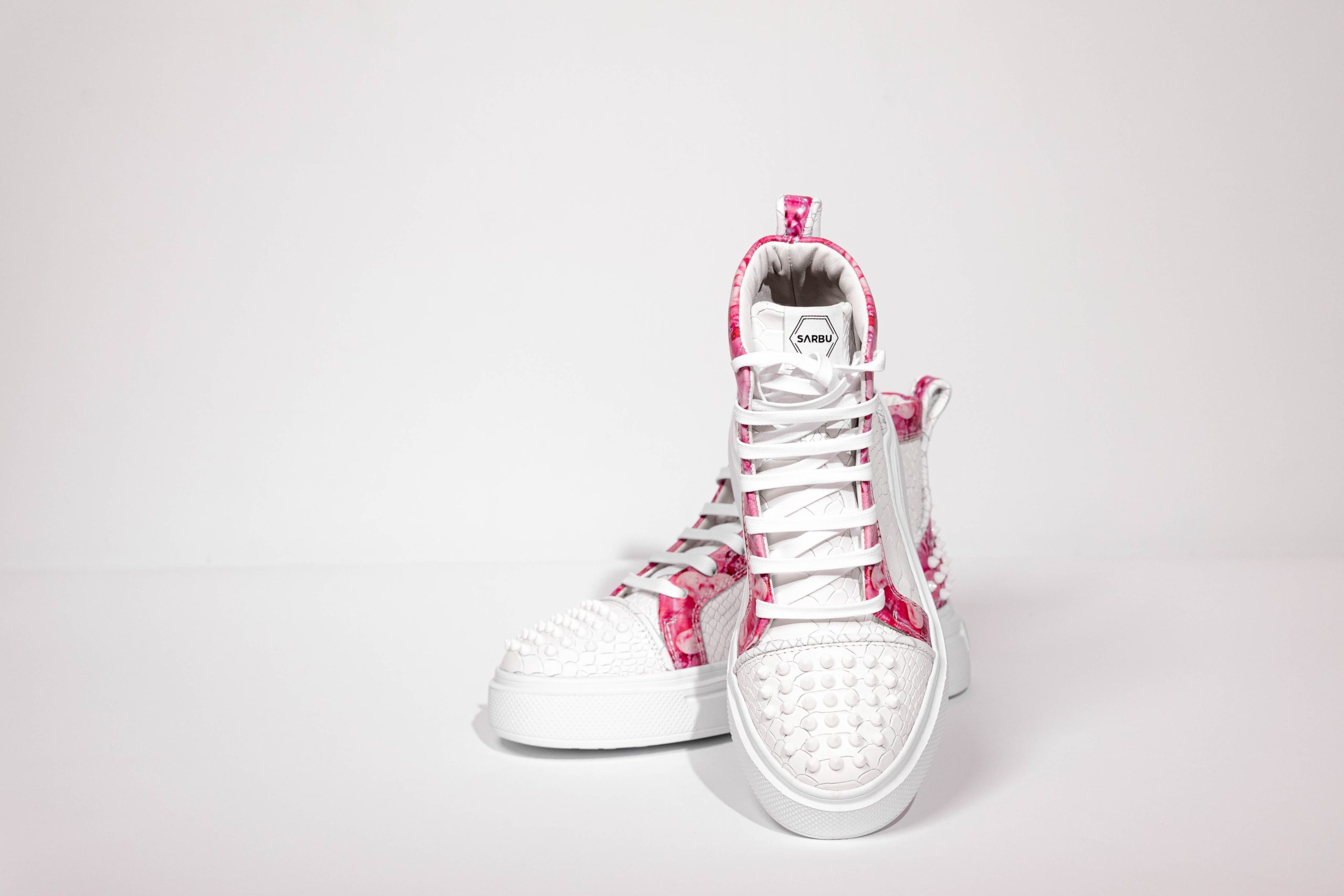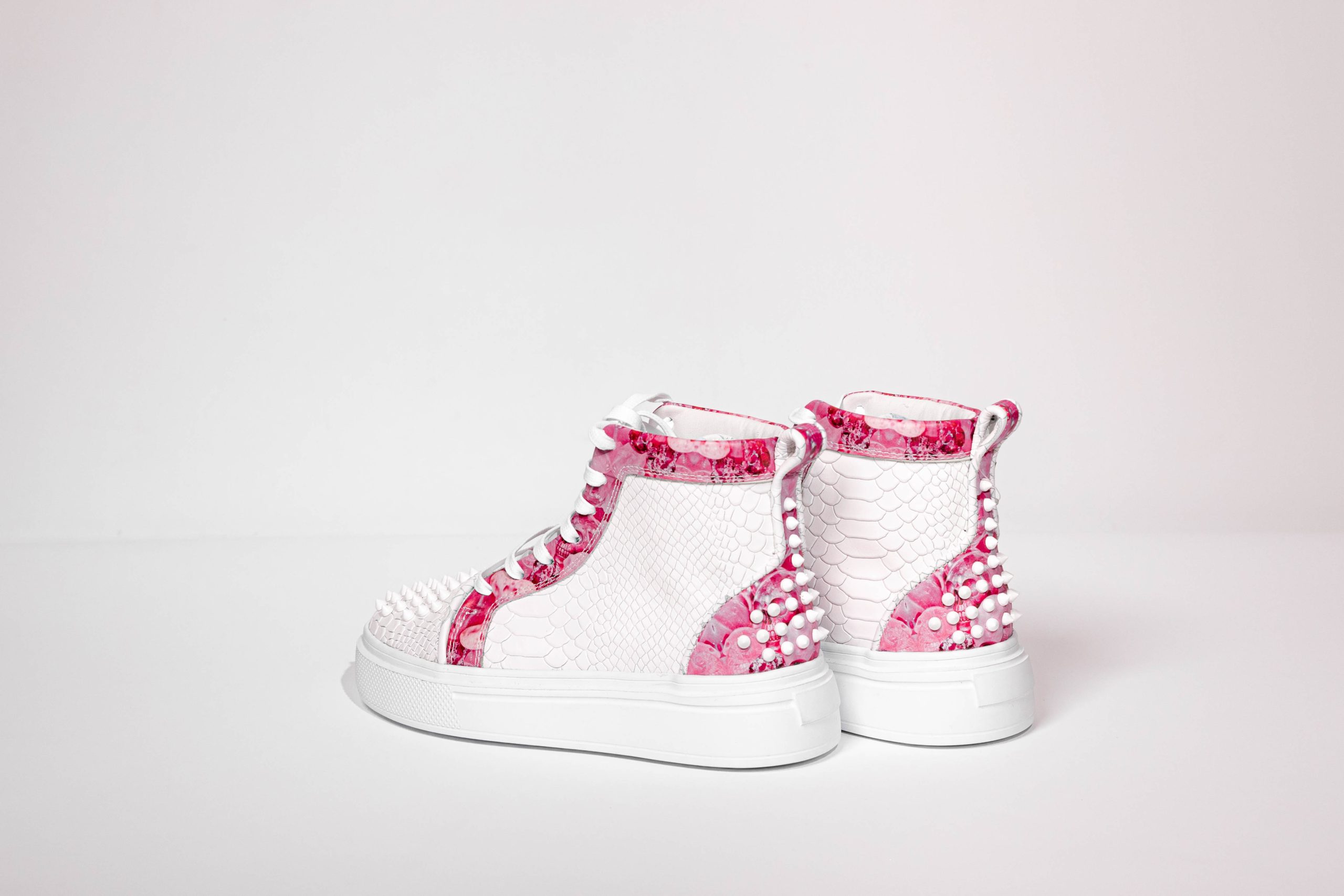 Embellished with large white studs and printed leather.
