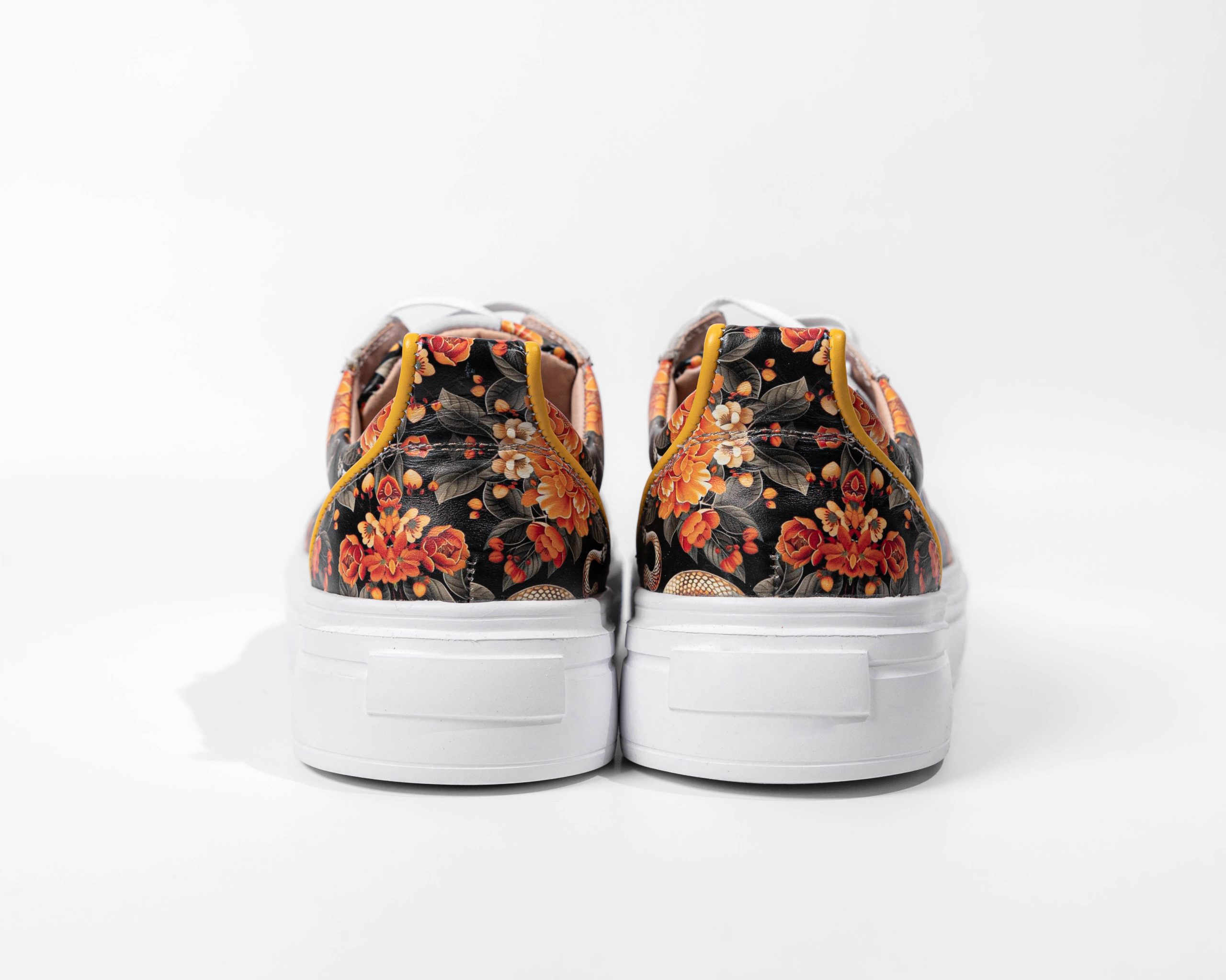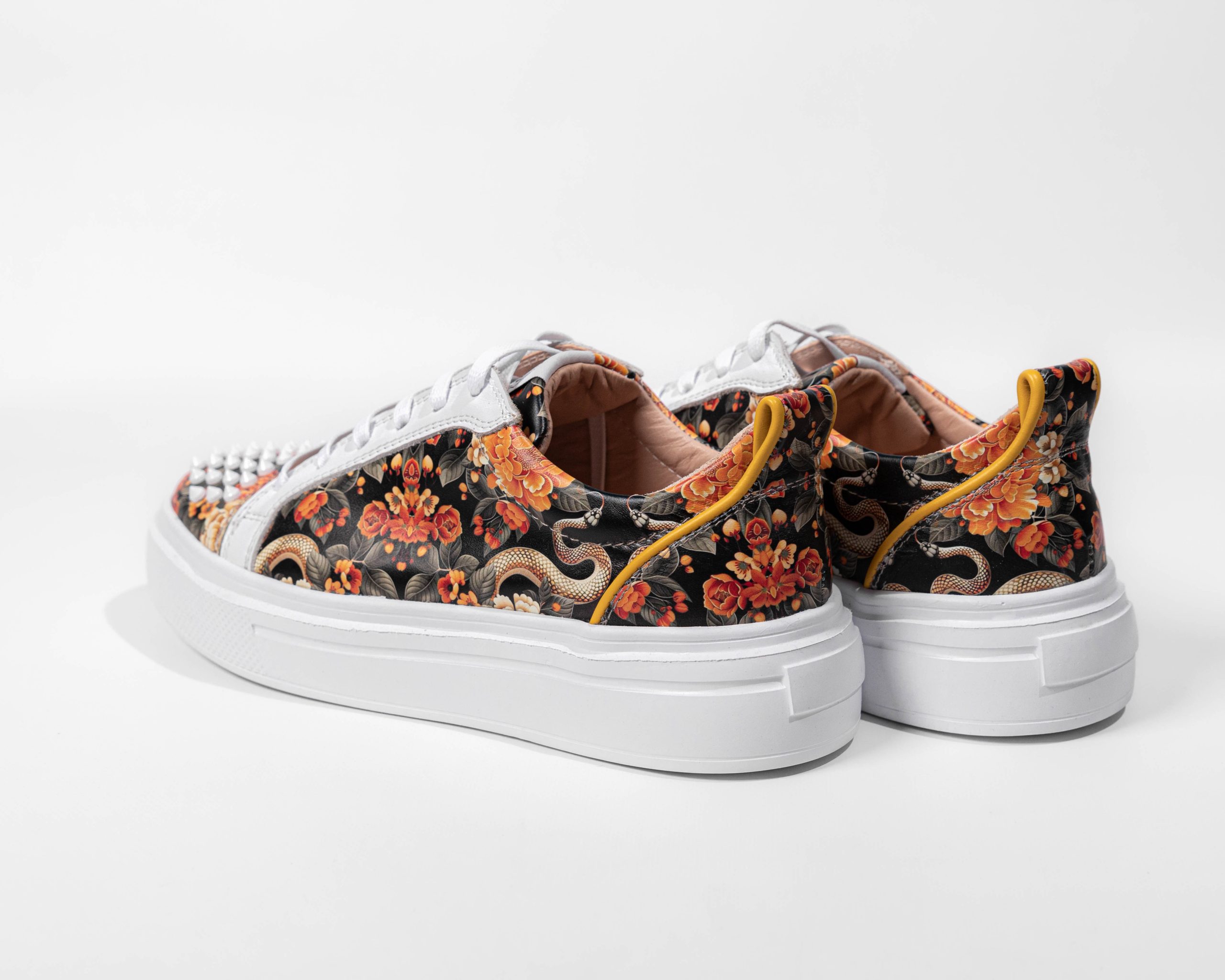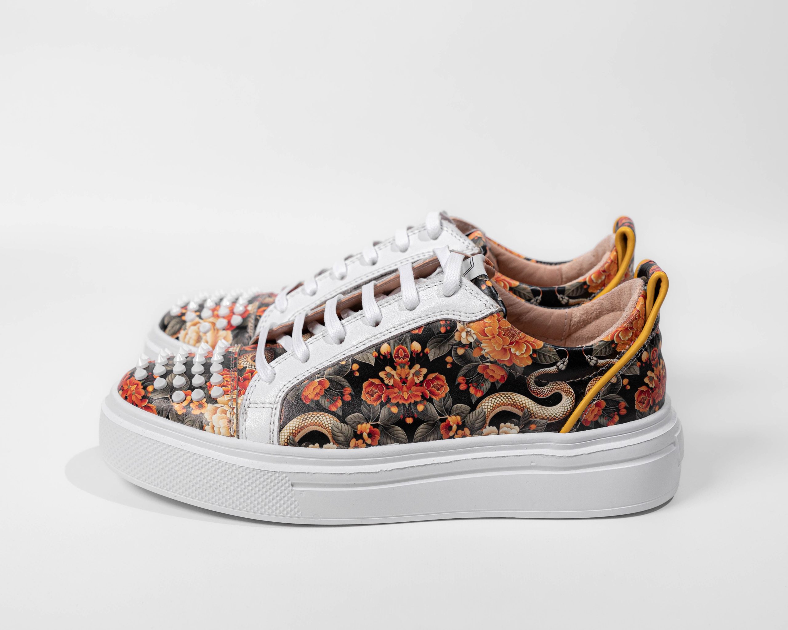 Made of printed leather and plain white leather. Accessorized with white studs and a print of flowers and snakes. Lace-up closure. Sole height: 4-4.5 cm, 100% EVA.