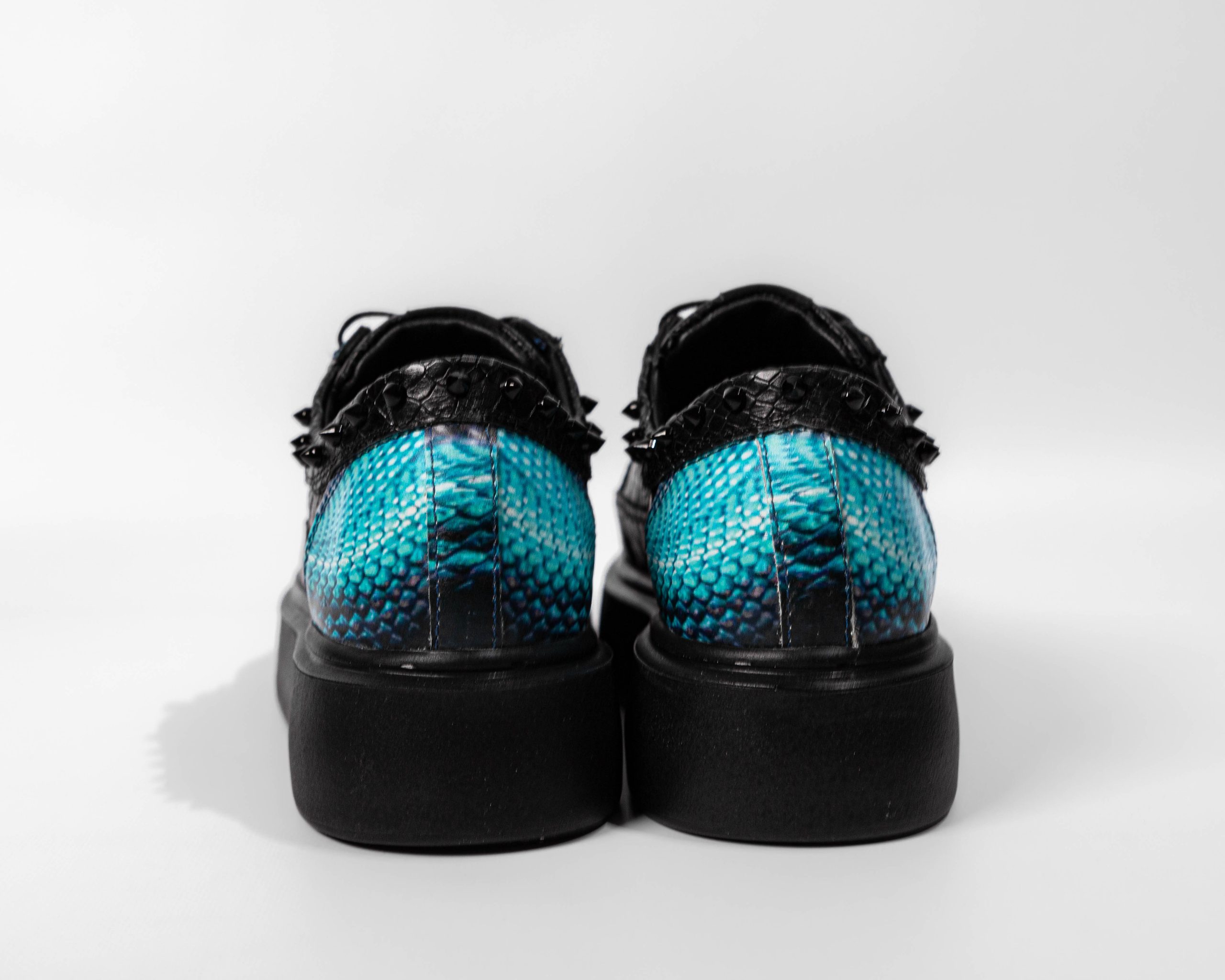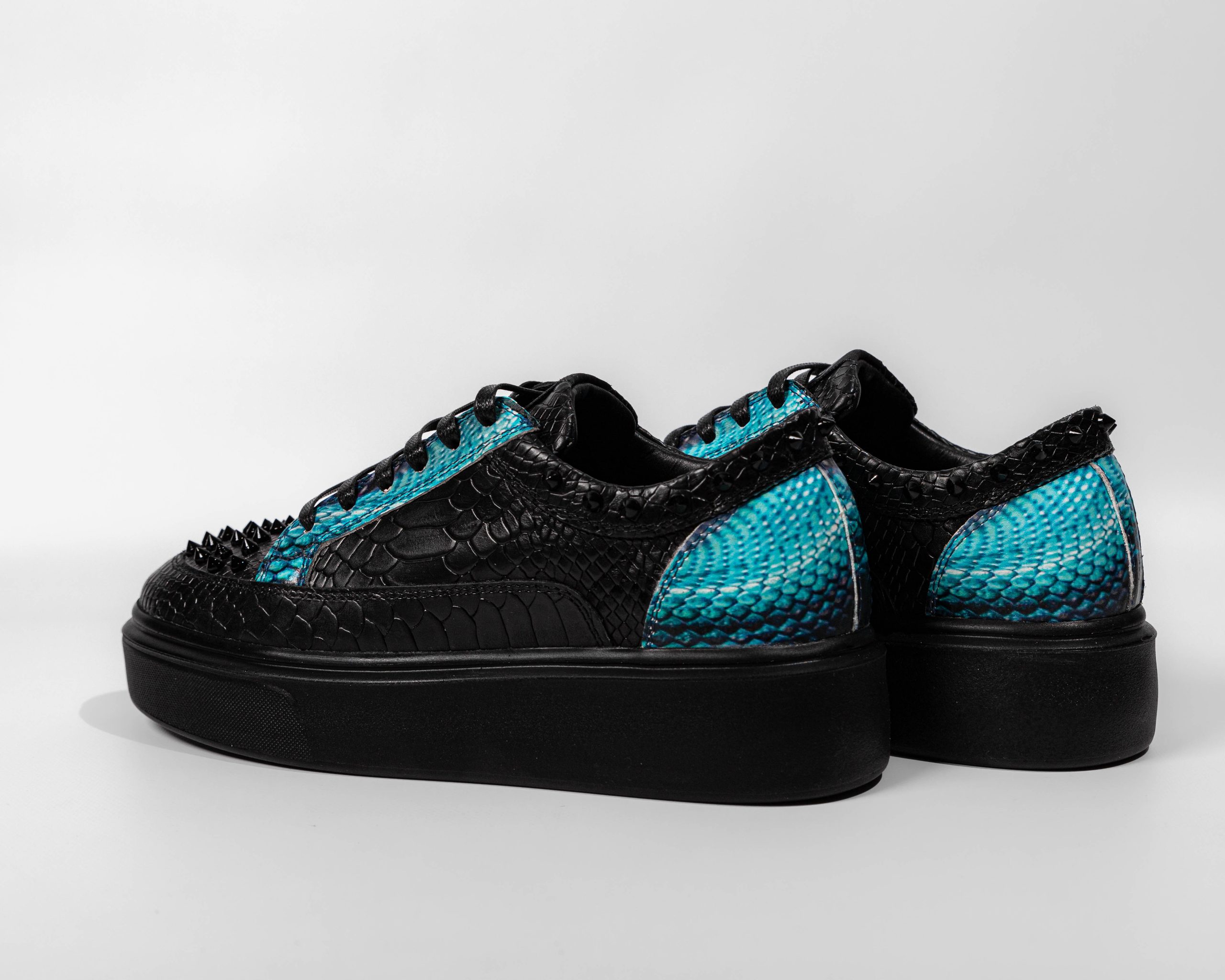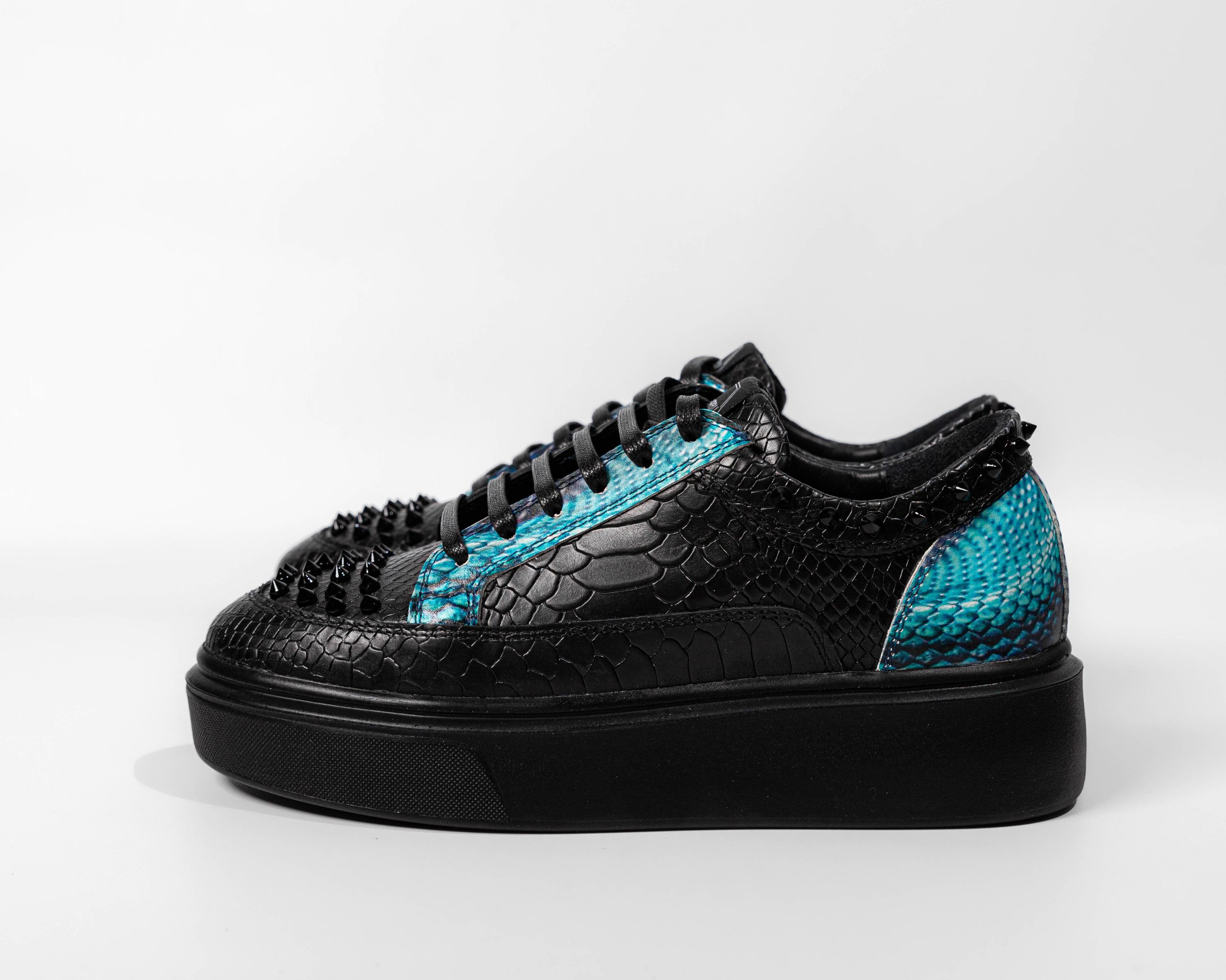 Made of python-embossed leather and printed leather. Accessorized with black studs and blue printed leather. Lace-up closure. Sole height 4-4.5 cm, 100% POLYURETHANE.